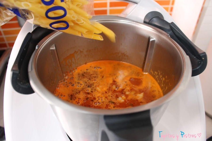 Agregamos la pasta y volvemos a programar 9 minutos, 100º, giro inverso y velocidad cuchara. Si queremos la pasta más al dente, pondremos solo 7 minutos.