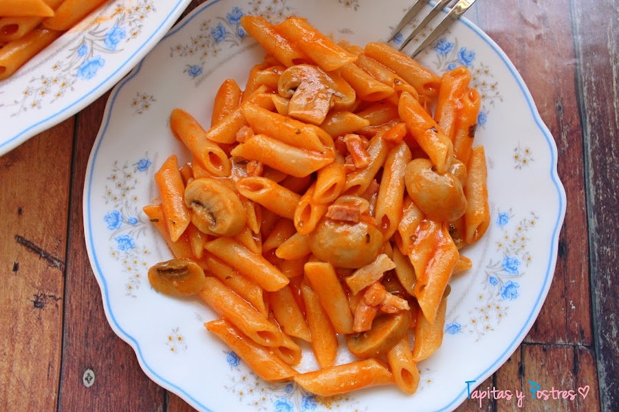 Vamos a cocer la pasta en abundante agua hirviendo durante 8 o 9 minutos, según nos guste de tierna. Mientras tanto, vamos a sofreír el bacon en una sartén con aceite hasta que esté doradito. Agregamos los champiñones, el ajo en polvo, orégano, pastilla de caldo desmenuzada y el tomate frito. Damos unas vueltas a fuego suave.