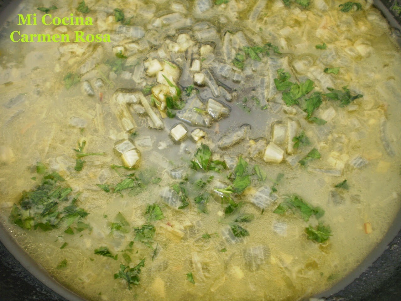 Echar el liquido de los berberchos junto con las hojas de perejil, darle un hervor, apartar del fuego e incorporar la carne de los moluscos en cuestión. Reservar.