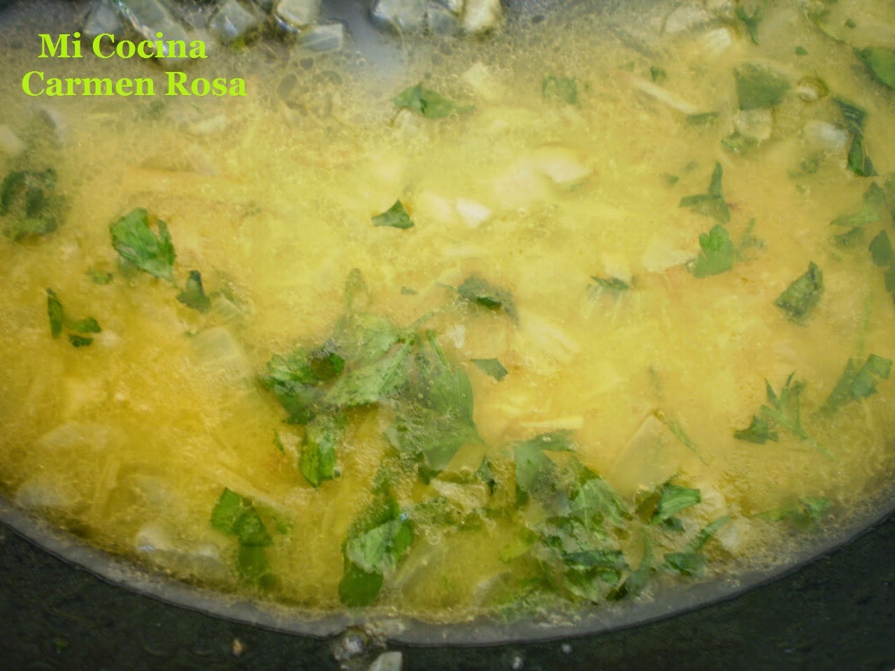 (Si apetece hacerlo más completo, añadiendo algunos langostinos, es en éste momento cuando se deben echar éstos en la sartén rehogándolos con la cebolla y el ajo)