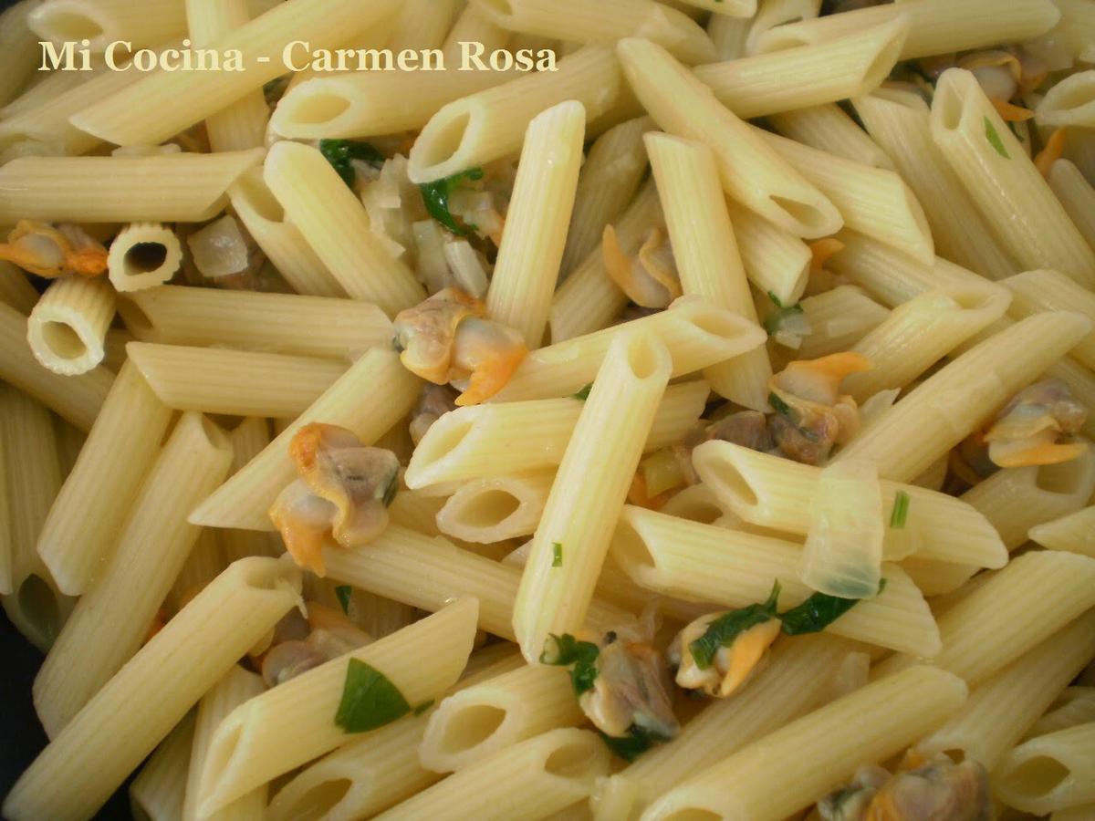 Allí, iluminada por esos rayos degusto ésta sencilla y receta: macarrones con berberechos en salsa verde.