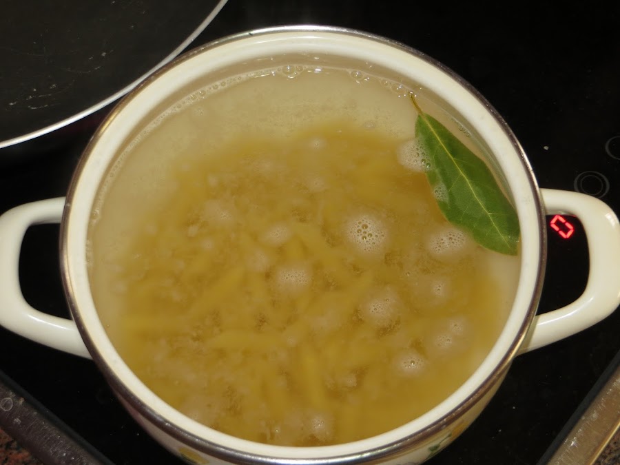 Lo primero que hacemos es cocer la pasta siguiendo las instrucciones del fabricante y del tipo de pasta. Ponéis agua a hervir en una cacerola con un poco de sal y una hoja de laurel y cuando esté el agua hirviendo echáis la pasta y la hervir según las instrucciones del paquete. Una vez pasado el tiempo, sacamos la pasta y la pasamos por agua fría.