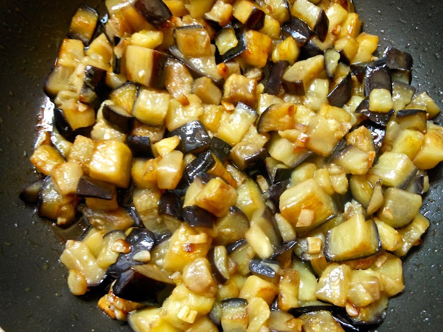 Cuando el aceite esté caliente introduce los dientes de ajo picados y la berenjena. Añade una poquita de sal fina y saltea el conjunto durante 15 minutos o hasta que las berenjenas estén tiernas.