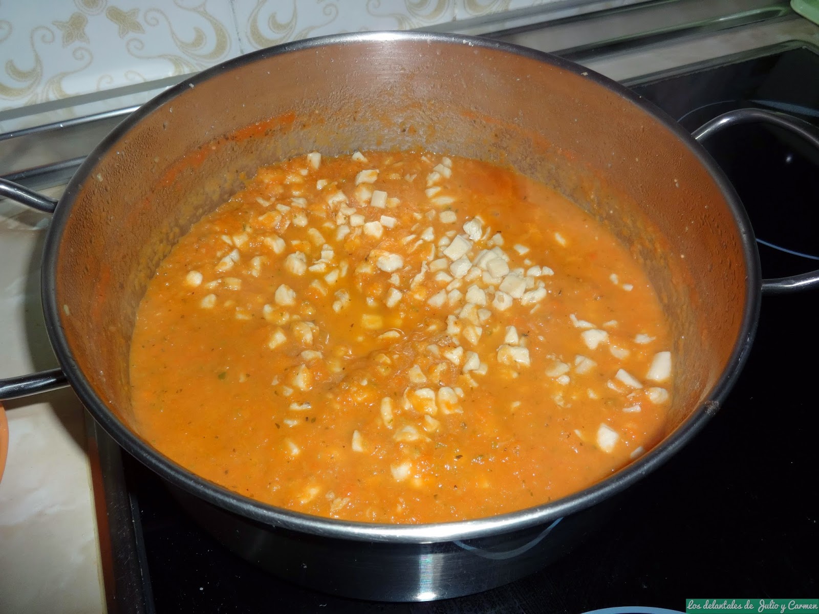 Dejamos unos minutos y pasaremos por la batidora para dejar una salsa mas fina. Volvemos a verter en una olla y echamos el pollo que teníamos reservado. pondremos a fuego bajo hasta que de un hervor, removiendo para que no se nos pegue.