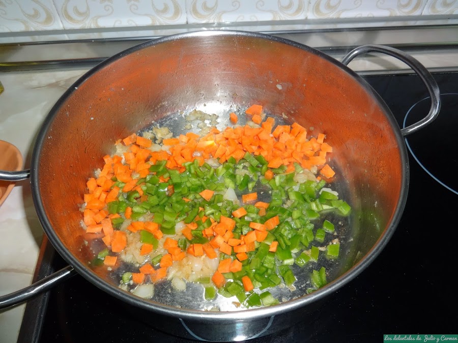 En la misma sarten, echamos un poco mas de aceite y pochamos la cebolla y el ajo. Cuando se doren, echaremos el pimiento y la zanahoria y dejaremos que se cocinen a fuego bajo hasta que estén tiernas, salando ligeramente.