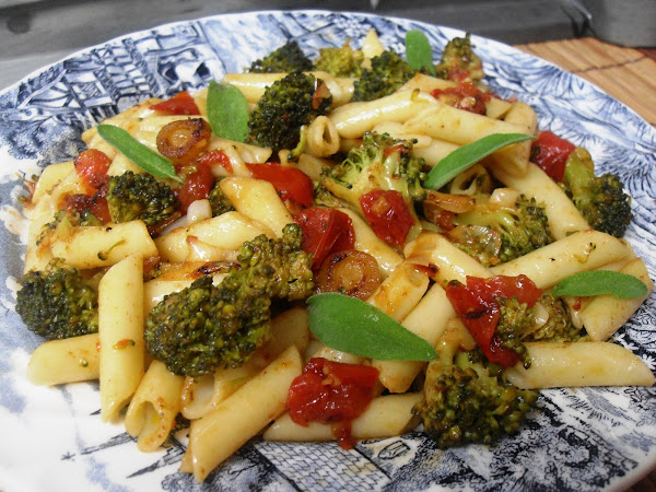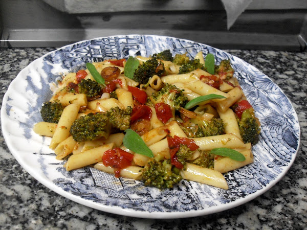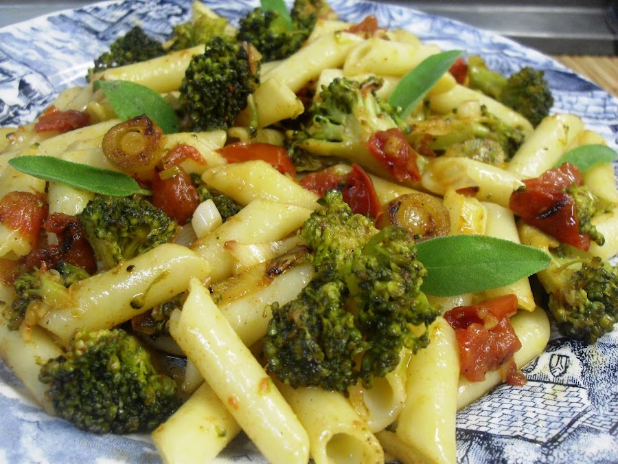 Añadir los macarrones, remover nuevamente todo, añadir unas hojas de salvia, (guardar otras para decorar) y dejar cocinar un par de minutos más removiendo para que quede mezclado.