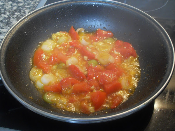 Calentar aceite y añadir el puerro, al par de minutos el ajo picado y a continuación el tomate cortado en pequeños trozos. Sofreír todo a fuego fuerte durante un par de minutos.