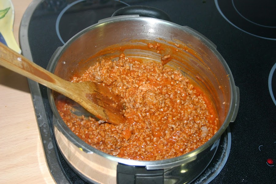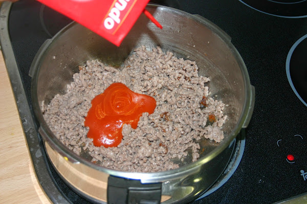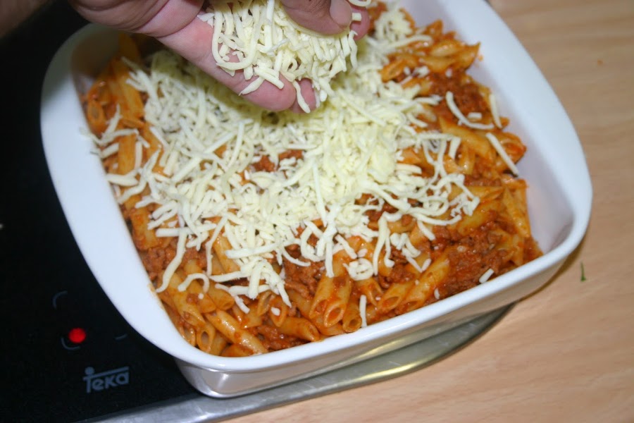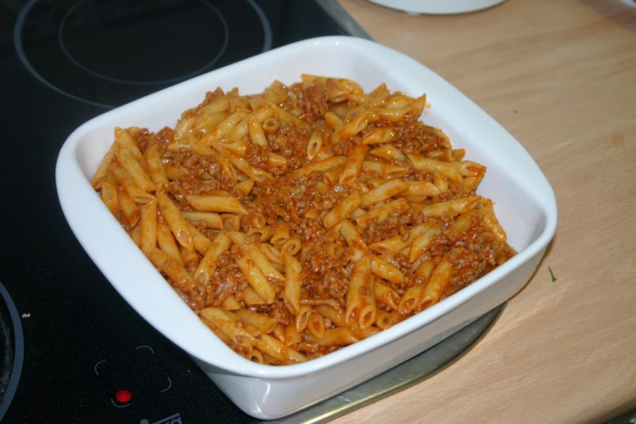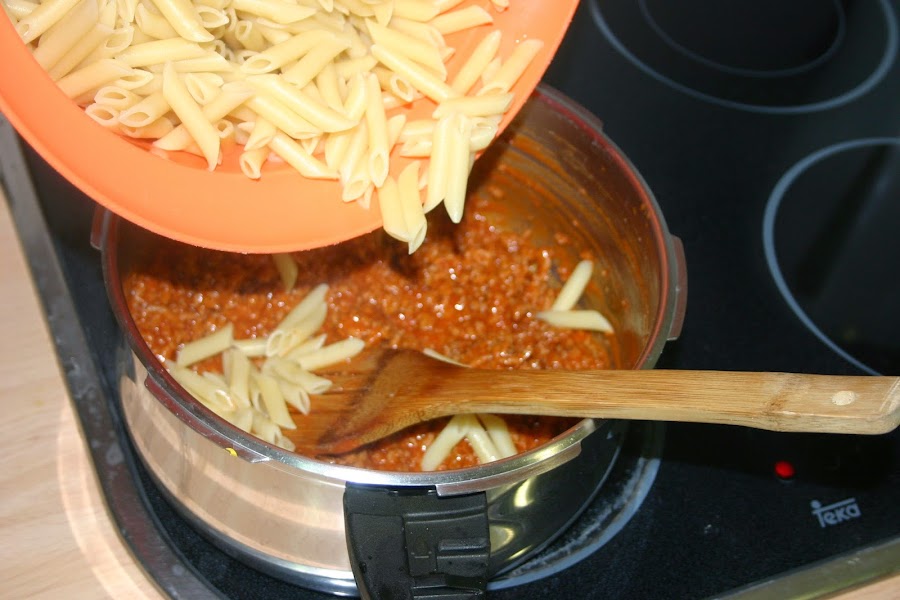 cuando este bien movida la carne y el tomate que este homogeneo, juntamos con los macarrones y lo removemos todo perfectamente