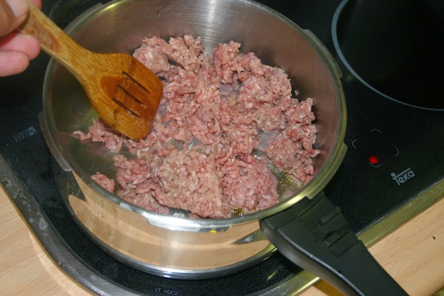 introducimos la carne picada, salpimentamos y la freimos