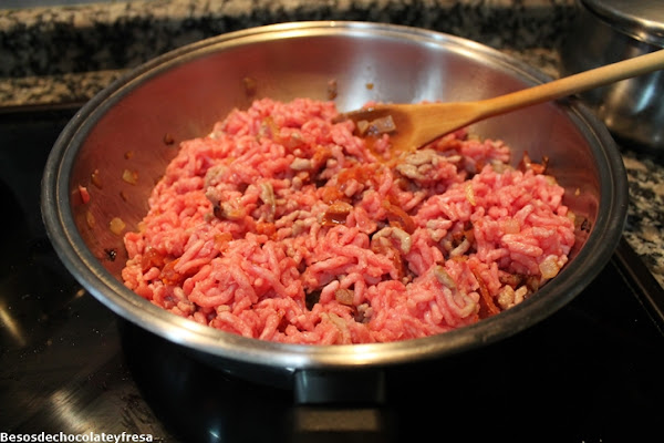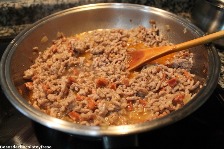 A continuación incorporamos a la sartén la carne picada y el chorizo en trozos pequeños.