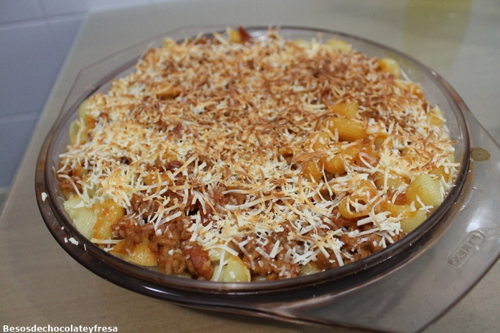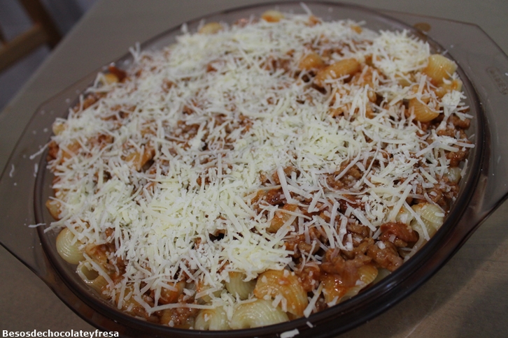 En una fuente disponemos la salsa con la carne y por encima los macarrones y el queso rallado (opcional), metemos al horno 5 minutos para que se funda.