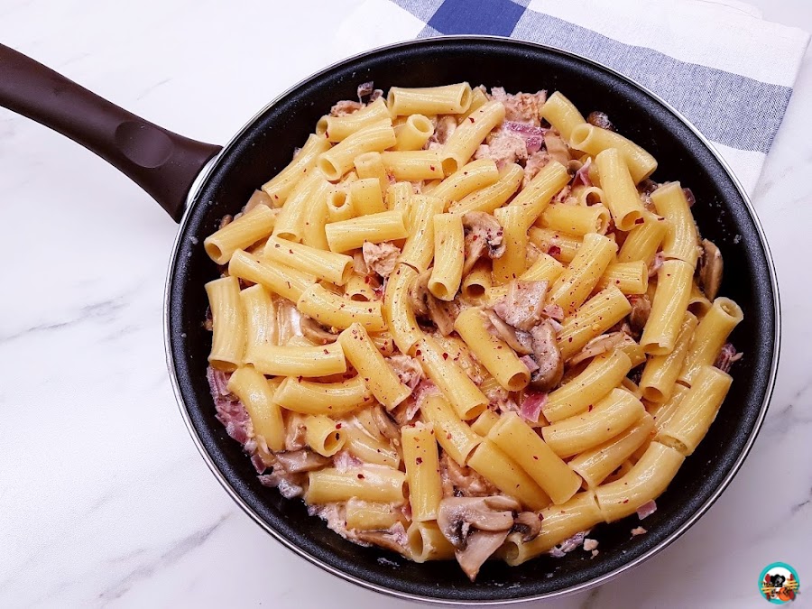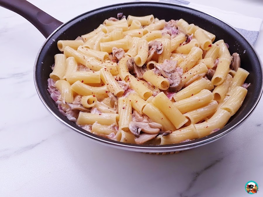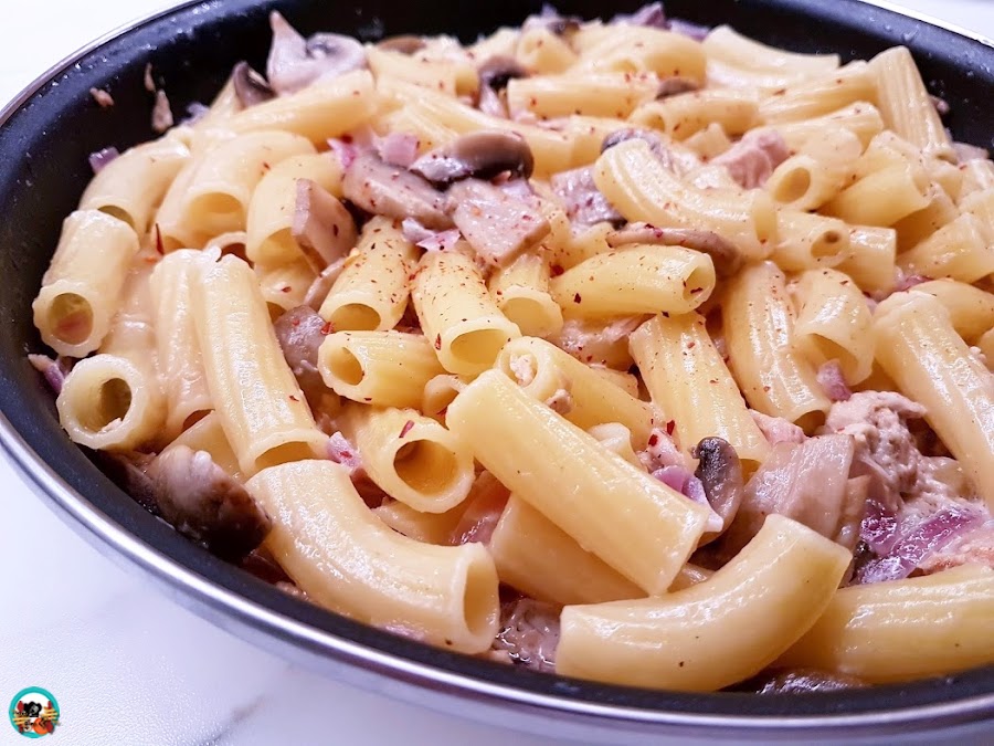 3.- Mientras tanto, ponemos a cocer los macarrones en agua hirviendo y sal durante 12 minutos o siguiendo las instrucciones del fabricante. Escurrimos los macarrones en un colador, mezclamos los macarrones con la salsa de champiñones y atún. Servimos los macarrones con escamas de pimentón ahumado.
