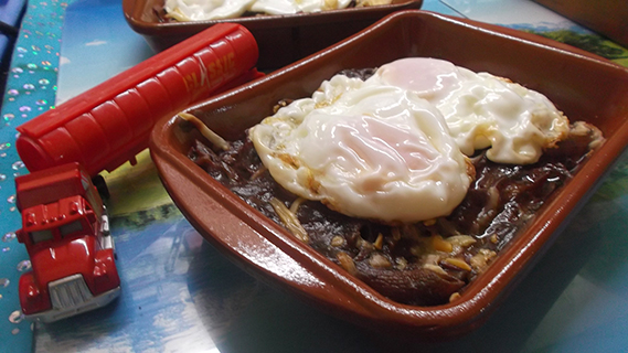 Colocamos sobre el queso gratinado 2 huevos fritos sobre cada cazuelita de barro.