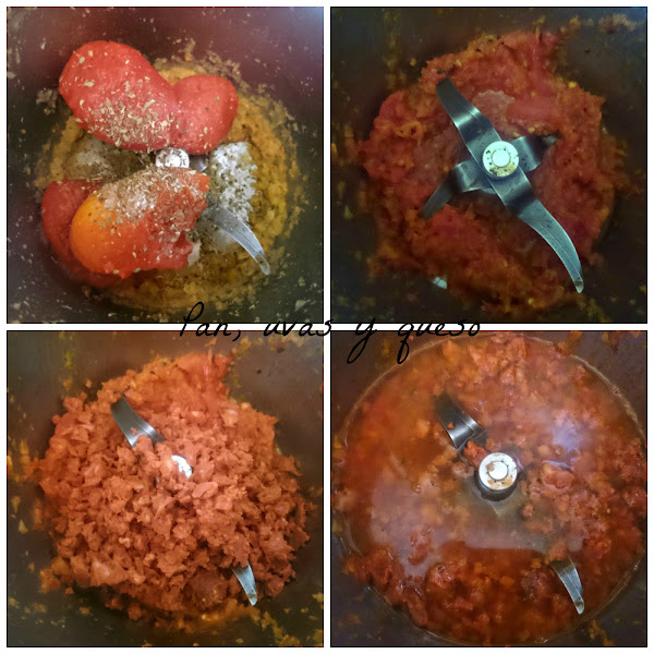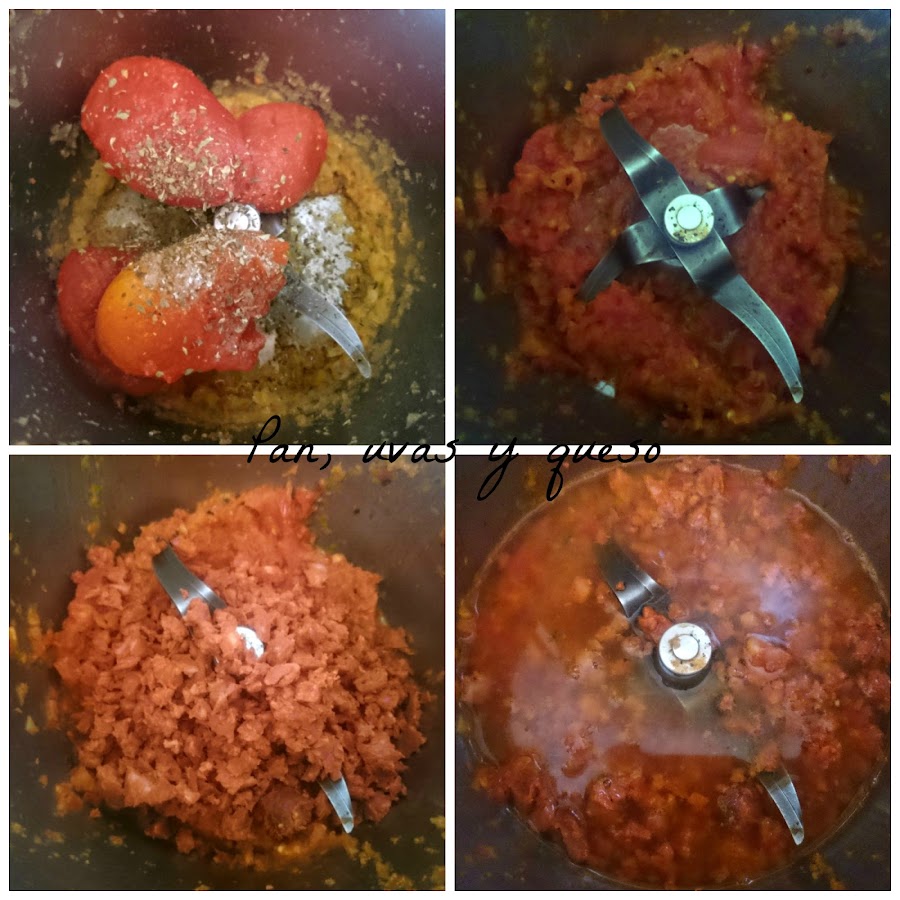 Añadimos el tomate, la sal y el orégano. Programamos 10 minutos, temperatura Varoma y velocidad 1 (si queremos el tomate más triturado daremos unos golpes de turbo).