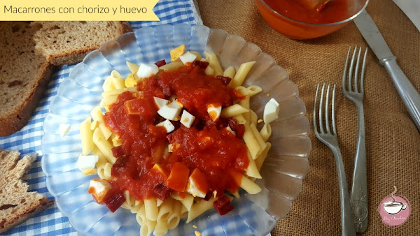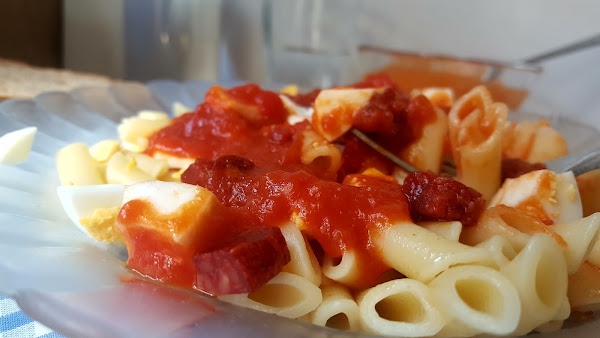 Ingredientes300 gr de macarrones250 gr de chorizo (si es de fabricación casera... mejor)2 huevosSalsa de tomate frito casera