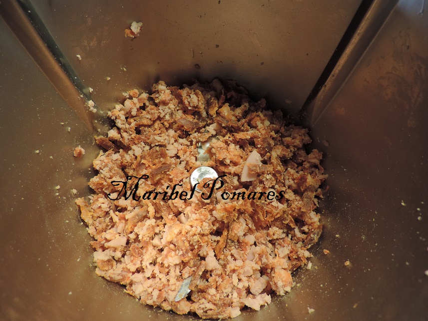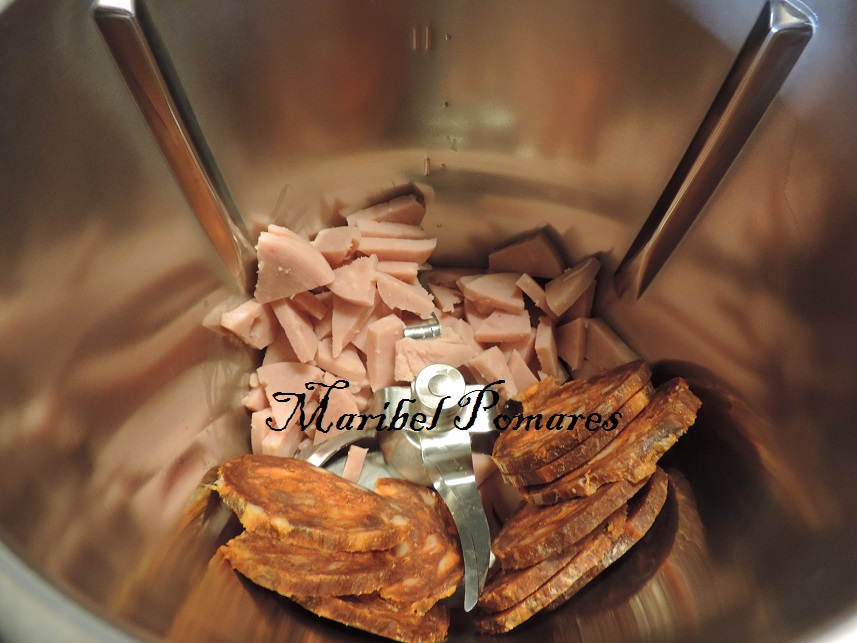 Ponemos el jamón de pavo cortado en trozos y el chorizo en rodajas de 1cm.