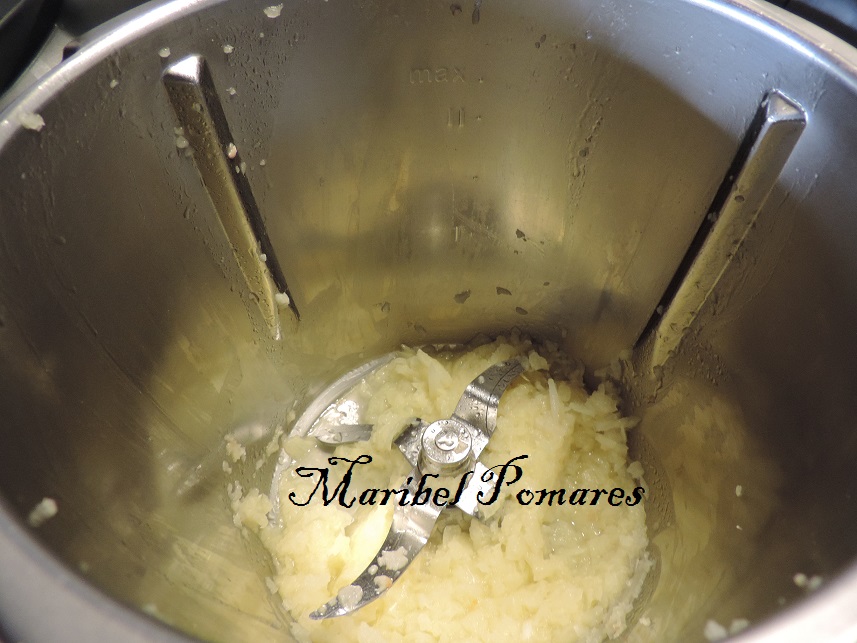 Ponemos en el vaso la cebolla y el aceite de oliva.