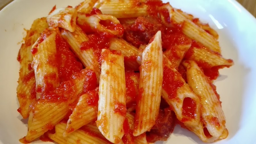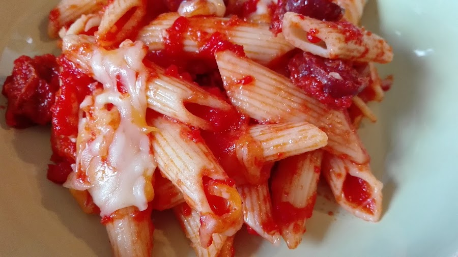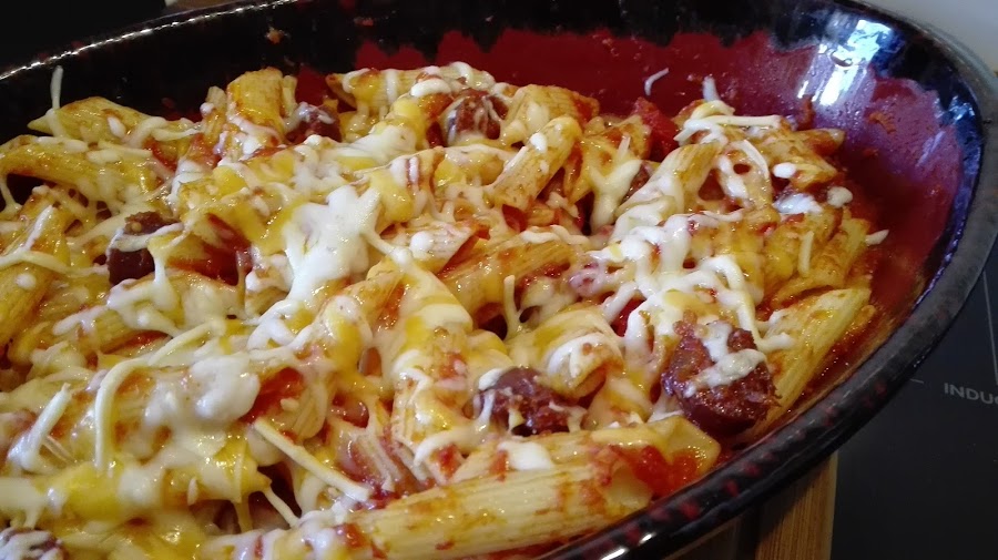 - Saltear el chorizo en una sartén, y mezclar con la salsa y los macarrones en una fuente refractaria.