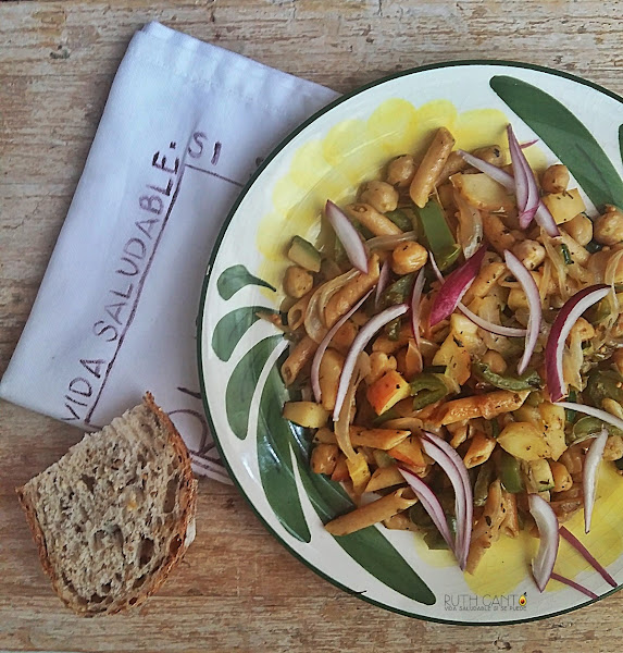 Saltear el calabacín y cuando lo tengáis hecho mezclar con todo lo anterior incluidos los macarrones y los garbanzos, saltear unos minutos y retirar del fuego y servir en los platos ( una vez más le añadí un poco de cebolla roja cruda, lo sé es mi vicio )