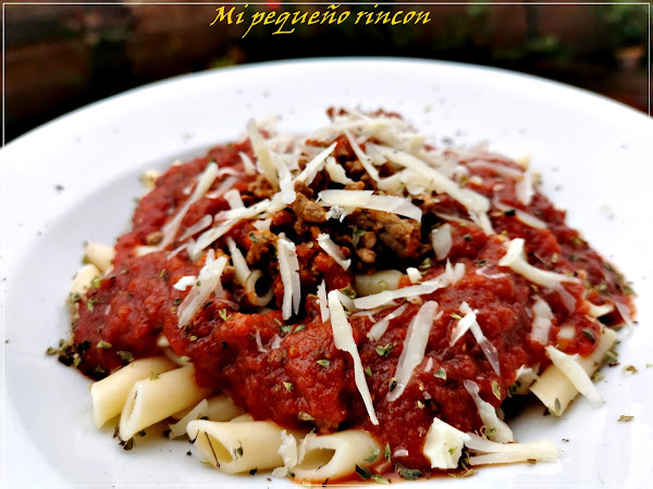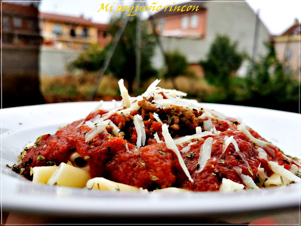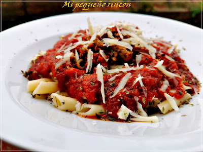 En otra sartén con aceite pochamos la cebolla y el pimiento hasta que todo quede muy doradito y incorporamos el tomate dejando cocinar todo junto unos 5 minutos para que se junten todos los sabores , si no os gusta encontraros los trocitos podéis triturarlos quedan muy buenos , incorporamos un poco de queso parmesano rallado y movemos otros dos minutos ,ya tenemos la salsa lista , ponemos macarrones en un plato ya que previamente los habremos escurrido y montamos el plato , el toque final es que con un cuchillo saquemos unas escamas del queso y las pongamos por encima de nuestro plato le da un gran sabor ..