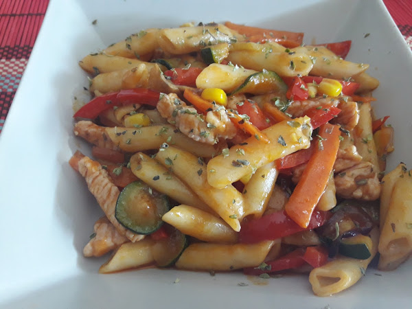 Sacar la pasta y escurrirla añadirla a la sarten con las verduras y añadir el tomate frito remover unos minutos y servir con oregano espolvoreado.