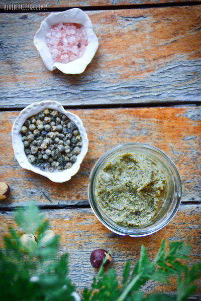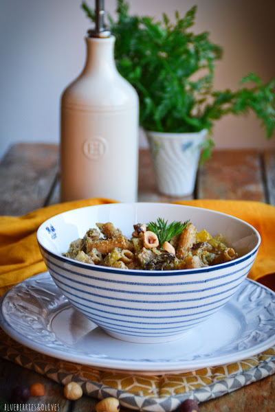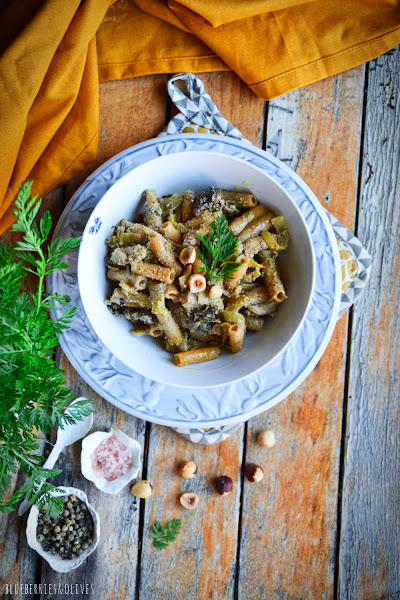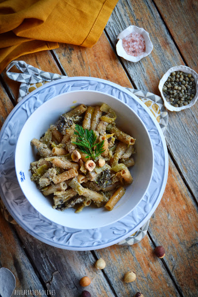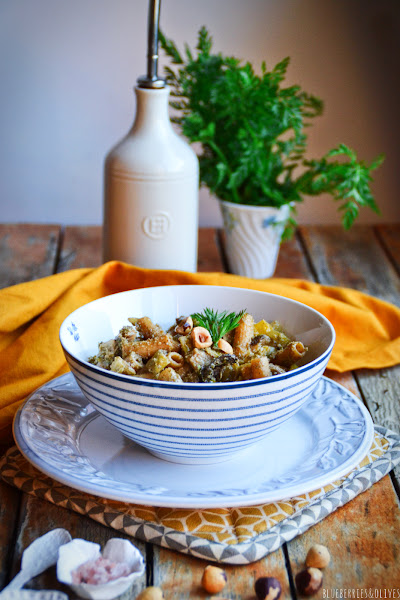 Esta última vez que compré hinojo, además de un bulbo gigante venía con tallos tremendamente inmensos, y no exagero...debían medir más de medio metro. Abundaban hojas de un verde precioso e intenso que me apetecía usar de alguna manera diferente que no fuera en ensalada como suelo hacer, y aprovechar ese sabor sutil anisado y súper aromático que tienen. Así que decidí probar combinándolo con algún fruto seco que no fueran los típicos piñones ni las nueces con las que ya lo suelo hacer y usé avellanas tostadas que tenía en la despensa.