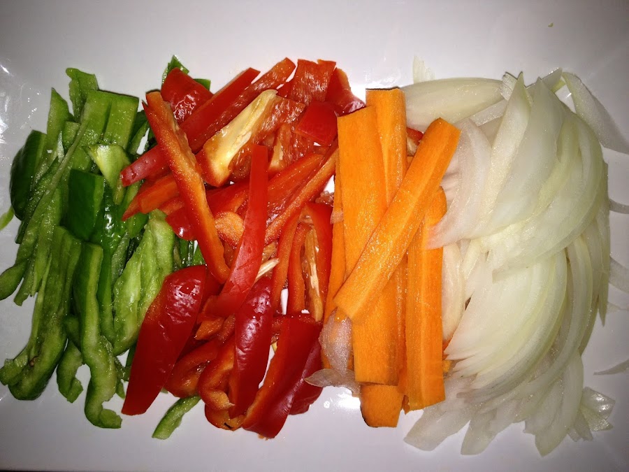 1 Comenzamos pelando la zanahoria y limpiando los pimientos quitándoles las pepitas . Unas vez limpios , los cortamos en tiras .