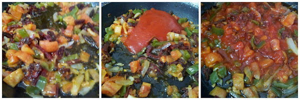 En una sartén con unas cucharadas de aceite de oliva virgen extra preparamos un sofrito con la cebolla, el ajo, el tomate natural y el pimiento verde todo ello cortado en trocitos pequeños, dejando unos minutos, hasta que la cebolla este pochada, añadimos el tomate frito mezclando lo con el sofrito.