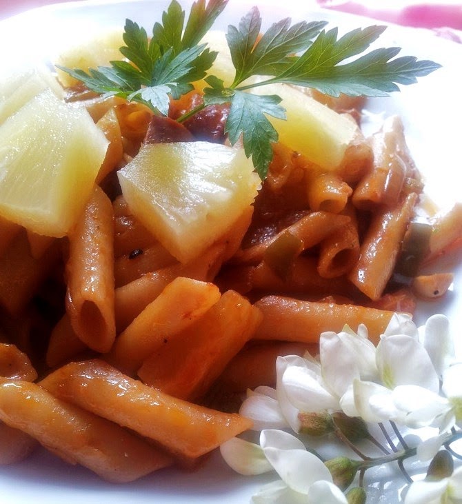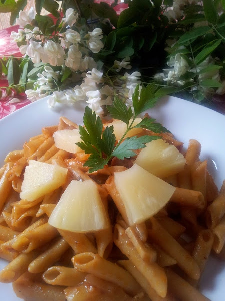 Espero que os guste, el sabor de la piña le da un sabor muy rico a la pasta, esta receta me la prepara mi marido muchas veces, bueno cuando le da el punto de hacer sus pinitos en la cocina, no me diréis que no es deliciosa, hay veces que me sorprende y me da por pensar ¡¡que me como primero la pasta o a mi marido!! jajajajaja