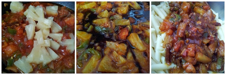Incorporamos la cantidad necesaria de las rodajas de piña dejándolo cocer unos minutos, una vez escurrida la pasta la ponemos en un bol y vamos incorporando el sofrito mezclando todo para que se mezclen los sabores, servimos y decoramos con más rodajas de piña al gusto.