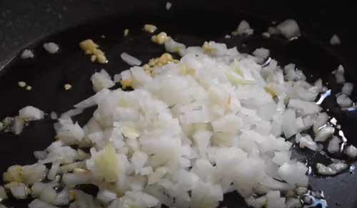 Después, salteamos unos segundos a fuego medio y antes de que los ajos comiencen a coger color echamos la cebolla también picada en trocitos. Ponemos un poquito de sal y dejamos rehogar unos minutos.