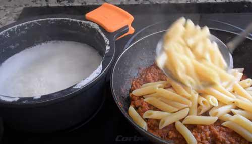 Cocemos los macarrones en abundante agua hirviendo el tiempo que nos recomiende el fabricante de la pasta. Hervimos hasta dejar al dente.Una vez que ya tenemos los macarrones hervidos, los colocamos en la sartén donde tenemos la salsa y lo mezclamos.