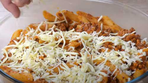 Finalmente, pasamos los macarrones con la salsa a un recipiente apto para horno y ponemos queso rallado por encima.