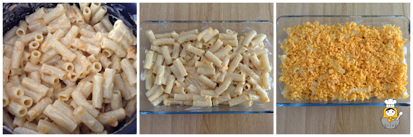 Mezclamos la salsa con los macarrones y los colocamos en una fuente apta para horno. Tapamos con la otra mitad del queso.