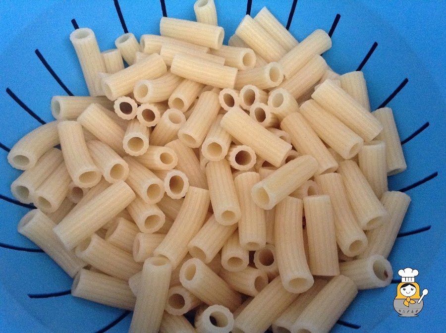 Primero cocemos la pasta al dente porque después se seguirá cociendo en el horno un poco más. Cuando esté cocida la escurrimos y reservamos.