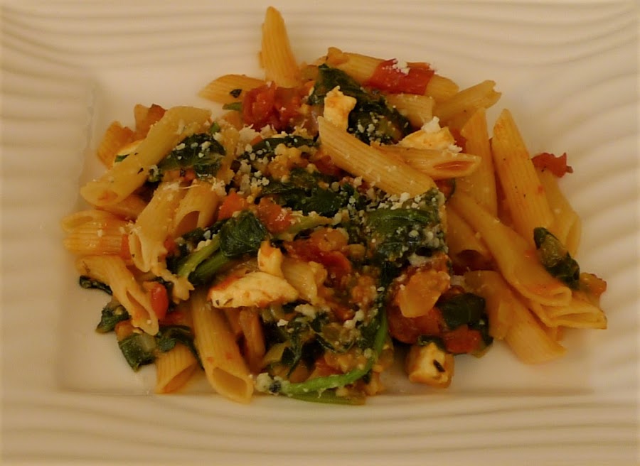 Mientras se cuece la pasta, incorporamos las espinacas en la salsa y mezclamos. En tres o cuatro minutos, habrá reducido su volumen e incorporaremos la pasta escurrida. Mezclamos todo bien.