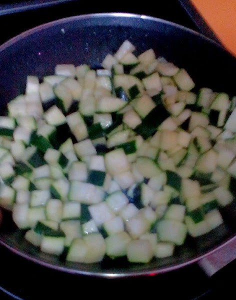 Por otro lado, freímos en una sartén con poco aceite el calabacín, cortado a dados dejando la piel, sin pelar, les añadimos orégano, pimienta y sal. Y no los pocharemos demasiado, que queden al dente. A mí particularmente, la verdura no me gusta muy hecha, si no que queden durita, pero esto ya es según el gusto de cada uno, si lo preferís dejáis más tiempo el calabacín hacerse.