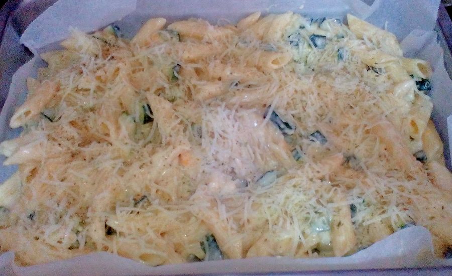 A continuación agregamos el calabacín a los macarrones con queso y mezclamos, seguidamente, los colocamos en una fuente para horno, cubrimos con queso rayado y un poco de orégano o albahaca y al horno a gratinar.