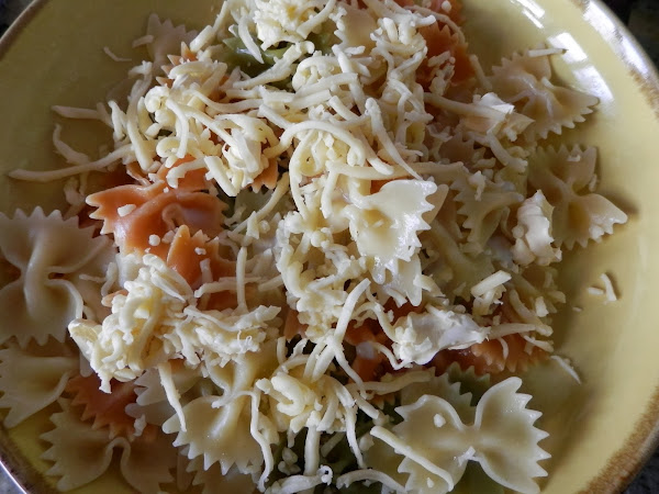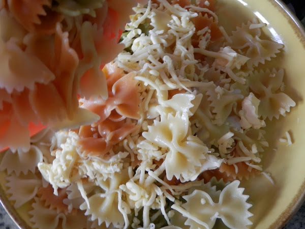 Una vez cocida y escurrida, ponemos la mitad en un plato o fuente de horno (o microondas) y ponemos la primera cucharada de mantequilla cortada a trocitos pequeños y la distribuimos por la superficie.