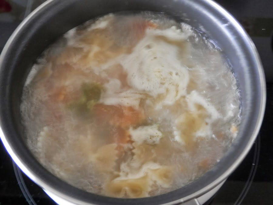 Cocemos la pasta en abundante agua con sal y un poquito de aceite para que no se pegue. (La pasta deberá quedar un poco dura, no al dente, un poco dura)