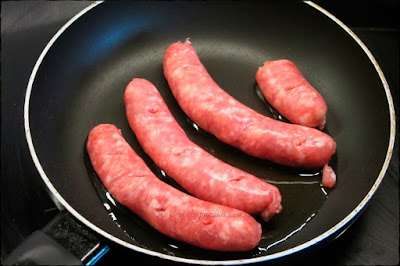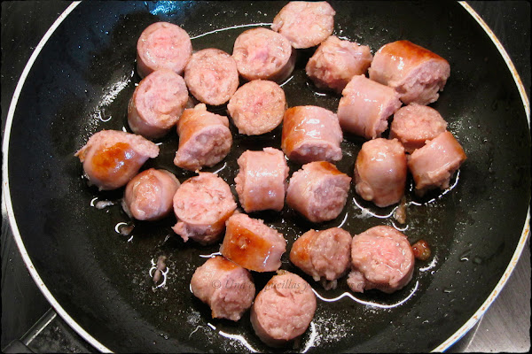 De mientras freir las salchichas en un poco de aceite de oliva, una vez cocinadas cortarlas en trozos y reservar.