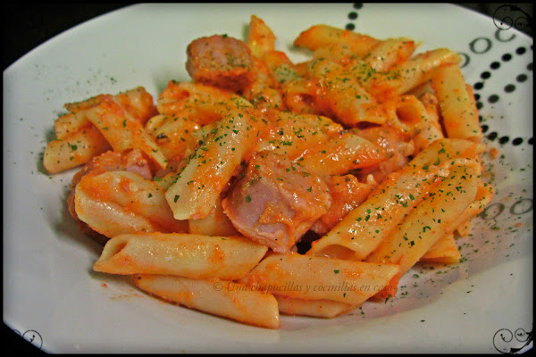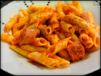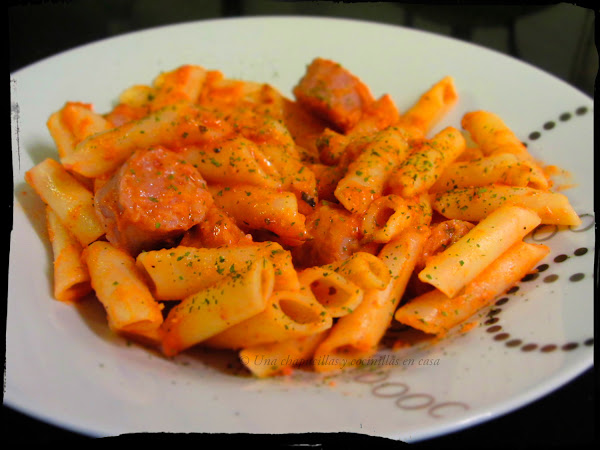 Pero vamos con la receta de hoy, es simple y resultona, son unos macarrones con salchichas frescas de carnicería con una salsa a base de tomate un poco diferente que combina muy bien.