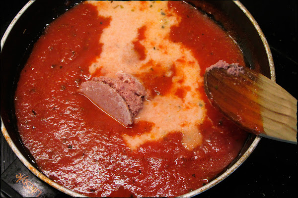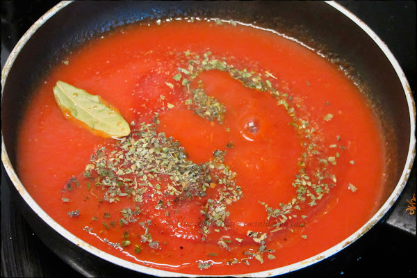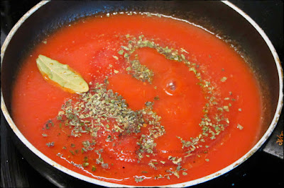 Ahora preparar la salsa. Poner un chorrito de aceite de oliva y cocinar el tomate triturado con una hoja de laurel,el ajo en polvo, la albahaca, el oregano, sal y un poco de azúcar para quitar la acidez. Cocinarlo unos minutos a fuego medio.