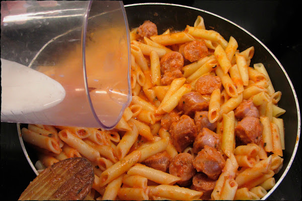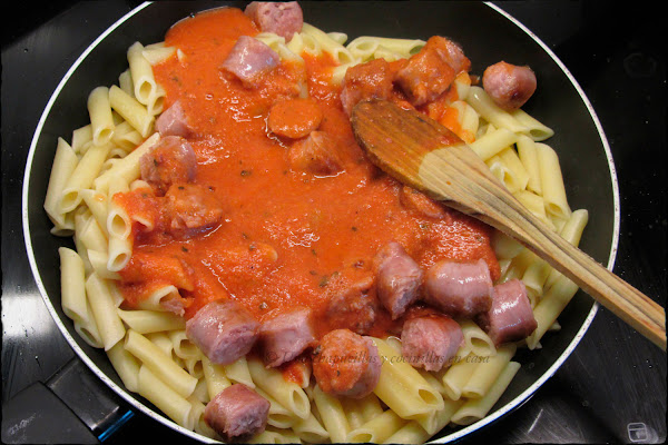 Incorporar las salchichas y los macarrones y mezclar. Cocinar un par de minutos a fuego bajo.