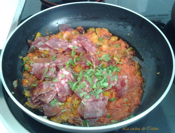 Incorporamos ahora el salchichón, el perejil picado, el pimentón, salpimentamos, mezclamos bien y cocemos a fuego lento durante 10 minutos.