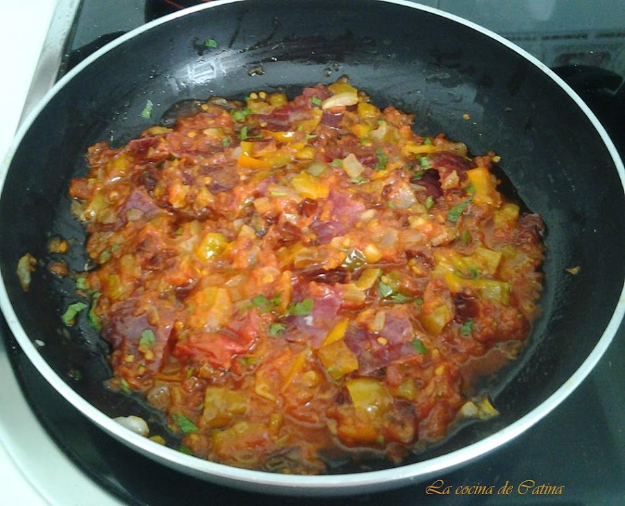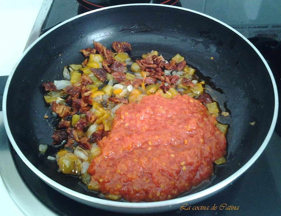 Ahora añadimos el tomate rallado y los tomates secos cortados en trocitos, seguimos friendo durante 20 minutos hasta que se haya consumido toda el agua del tomate.