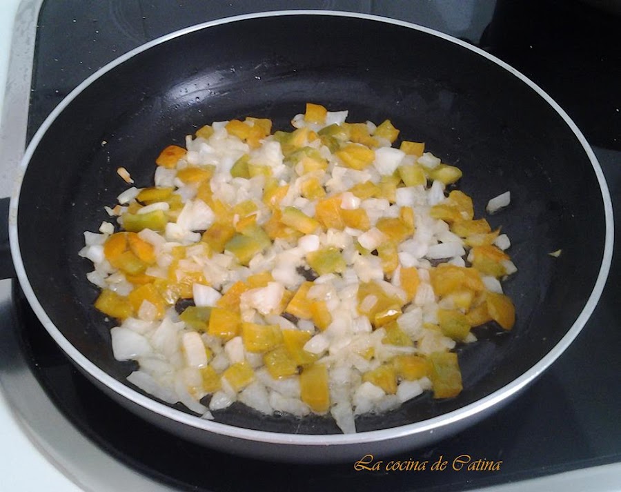 Calentar el aceite en una sartén grande y sofreír la cebolla durante 5 minutos removiendo de vez en cuando, añadir los pimientos y freír durante 5 minutos más.