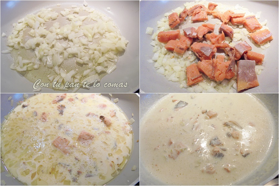 1. En una sartén con un poquito de aceite, pochamos la cebolla picada y cuando esté blandita y transparente añadimos el salmón en trozos, sin piel ni espinas. Sazonamos con sal y removemos un poco.