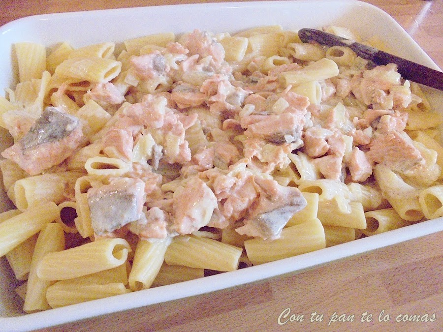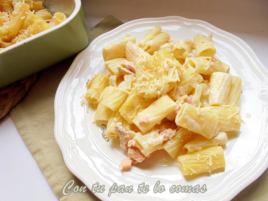 3. En una fuente de horno mezcla la salsa de salmón con los macarrones. Cubre con queso rallado y gratina en el horno.