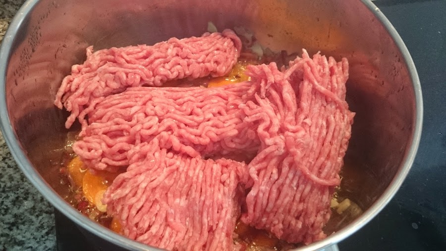 Cuando este doradito le añadimos la carne picada junto con las especies.